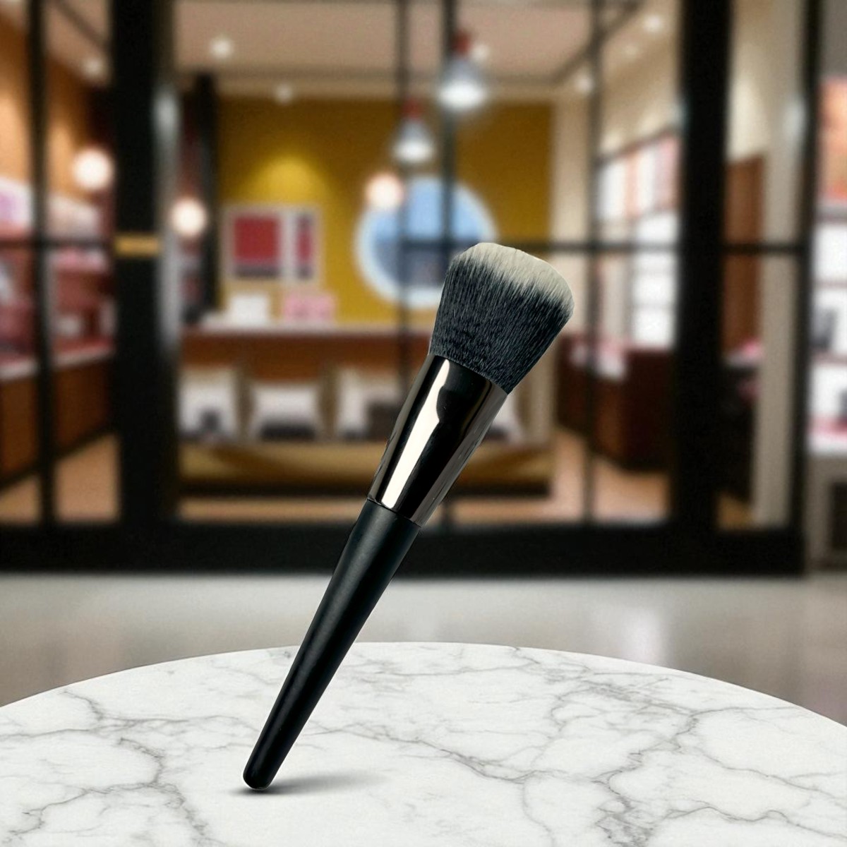 Brocha grande para aplicar polvos con acabado profesional. Mango negro elegante.