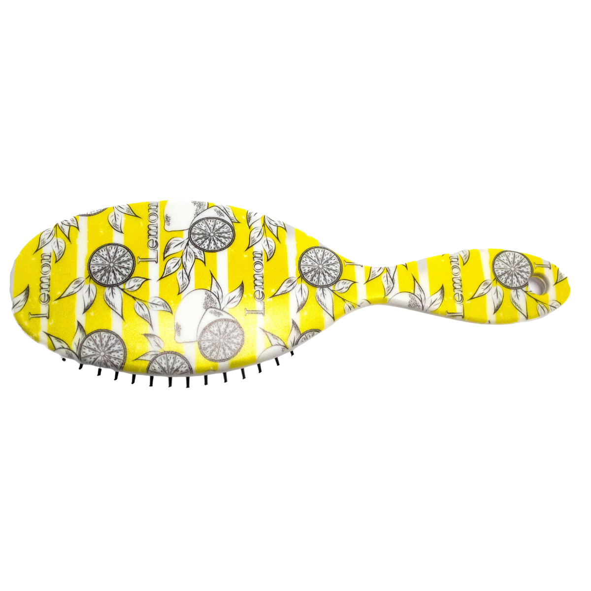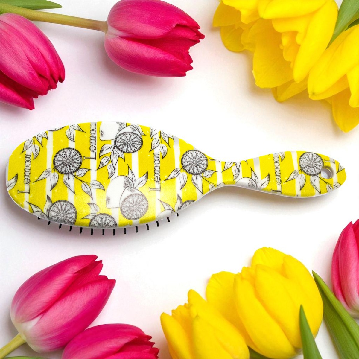 Cepillo ligero con un alegre estampado de flores amarillas. Ideal para desenredar suavemente el cabello, aportando un toque de color y estilo a tu rutina diaria.
